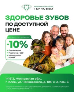 Авторская стоматология Терновых относится с заботой к самым ценным. Ветеранам труда, многодетным семьям и участникам СВО дарим скидку 10% на все услуги! Подарите себе здоровую и красивую улыбку!