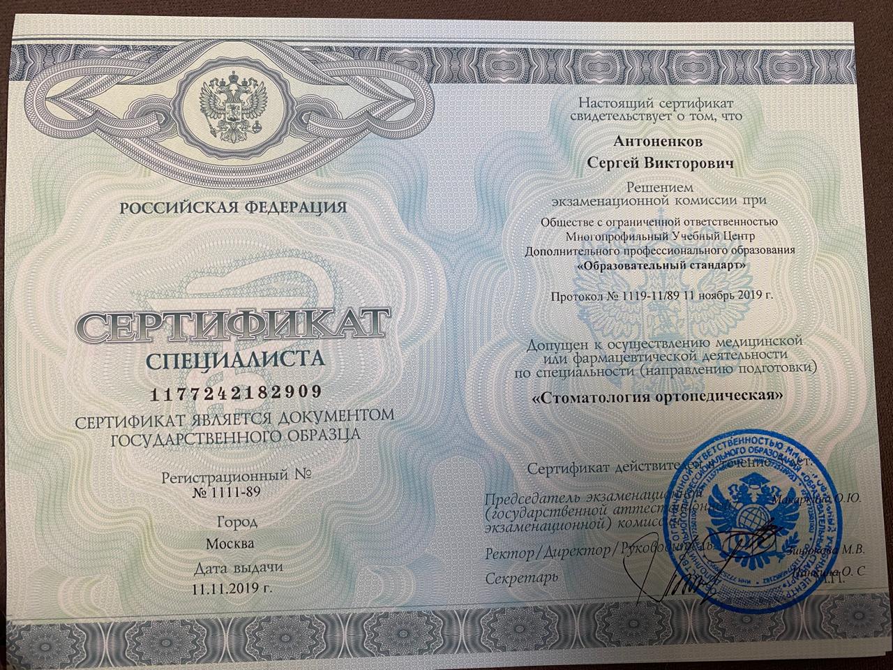 Сертификат специалиста 1177242182909 № 1111-99, выданный 11 ноября 2019 года в Москве. Подтверждает допуск к осуществлению медицинской или фармацевтической деятельности по специальности «Стоматология ортопедическая».