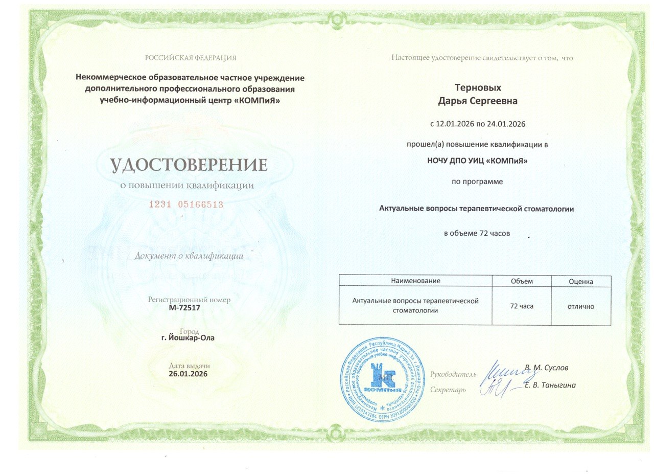 Удостоверение № 1231 05166513 от 26 января 2026 года, выданное НОЧУ ДПО УИЦ «КОМПиЯ» в г. Йошкар-Ола. Подтверждает успешное прохождение курса «Актуальные вопросы в терапевтической стоматологии».