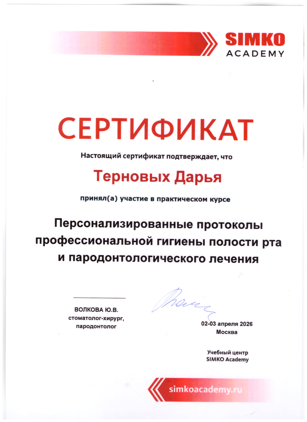 Сертификат SIMKO ACADEMY, Москва, 2026 год